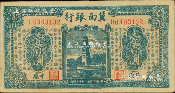 民国三十四年(1945年)冀南银行蓝色西湖戚继光塔壹百圆,平原地名;台湾藏家出品,未折九五成新