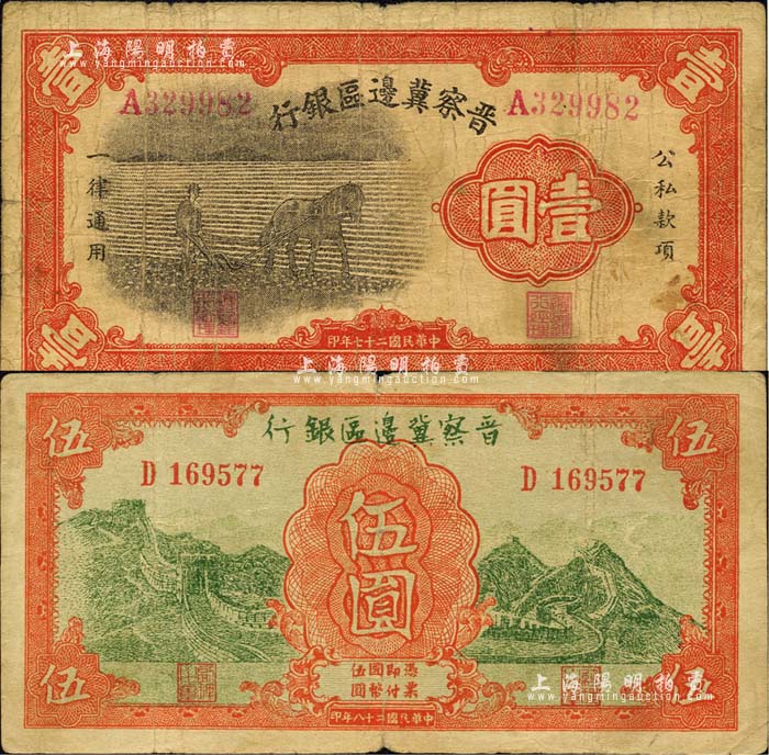 晋察冀边区银行1938年马耕地壹圆、1939年长城图伍圆共2枚不同,台湾藏家出品,七至七五成新
