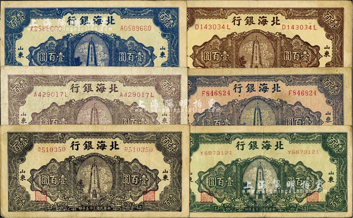 民国三十五年(1946年)北海银行纪念塔图壹百圆共6种不同,正背颜色各有差异;台湾藏家出品,七至八成新