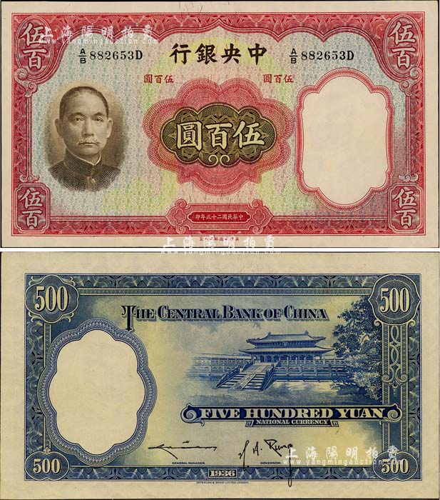 民国二十五年(1936年)中央银行华德路版伍百圆,九八成新
