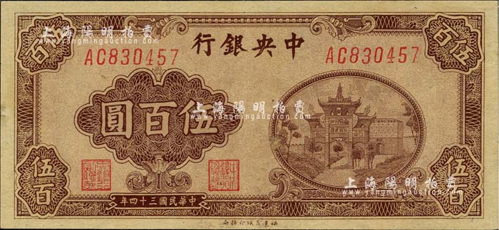 民国三十四年(1945年)中央银行福建百城版伍百圆,薄纸版,九成新