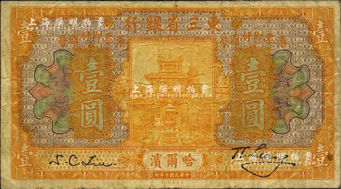 民国十年(1921年)东三省银行壹圆,哈尔滨地名,海外藏家出品,七成新