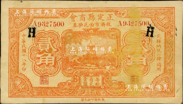 民国十八年(1929年)正定县商会救济市面兑换券贰角,此券乃历史同时期之老假票,但形制逼真,流通痕迹明显,八成新