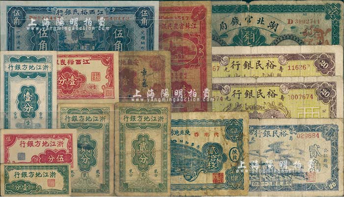 省钞14枚,详分:寿光裕民银行1941年贰角、1943年贰拾圆2枚;湖北官钱局1914年铜元壹百枚;江西裕民银行壹分、1933年伍角;安徽地方银行壹分;江苏省农民银行1936年壹角;浙江地方银行横式壹分、伍分,竖式壹分、贰分2枚;陕北地方实业银行1938年贰拾枚;台湾明德堂藏品,六至八五成新,敬请预览