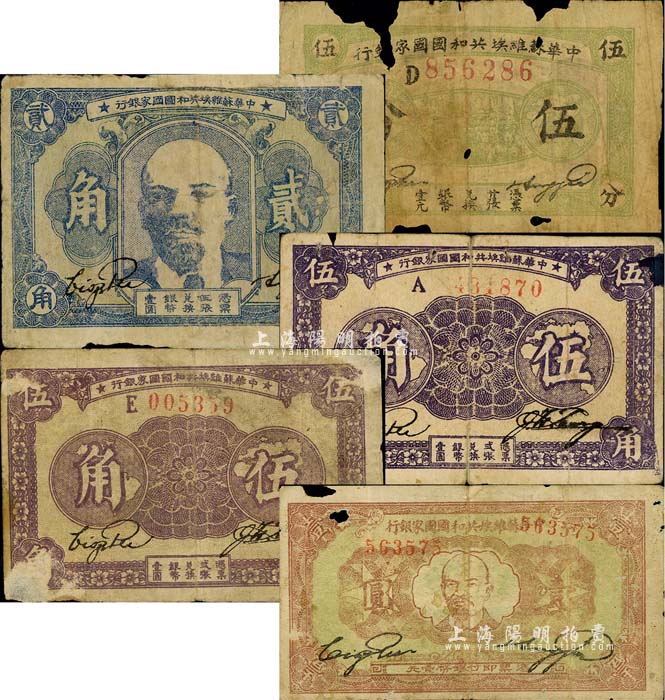 中华苏维埃共和国国家银行纸币5枚,详分:1932年伍分,D字轨;1932年列宁像贰角;1933年伍角2枚,分别为紫褐色A字轨和紫色E字轨(背面颜色亦不同);1933年列宁像壹圆;其中4枚有破损、1枚有修补,五至六成新