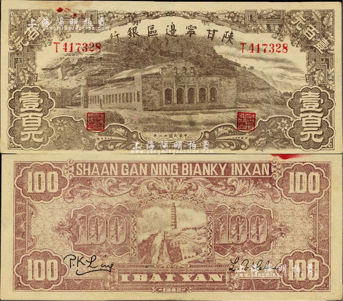 民国卅一年(1942年)陕甘宁边区银行大型大会堂图壹百元,美国藏家出品,近九成新