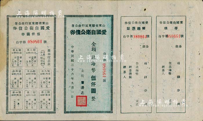 民国三十六年(1947年)山东省胶东区行政公署·爱国自卫公债券,金额北海币伍仟圆,附带完整息票;八成新
