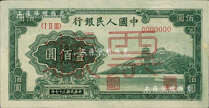 第一版人民币“万寿山”壹佰圆票样,正背面合印,未折九五成新