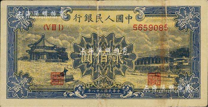 第一版人民币“颐和园”贰佰圆,海外藏家出品,七五成新