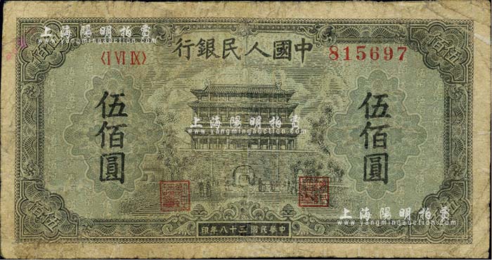 第一版人民币“正阳门”伍佰圆,有修补,近七成新