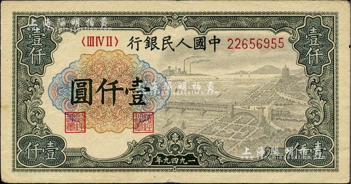 第一版人民币“钱江桥”壹仟圆,海外藏家出品,八成新