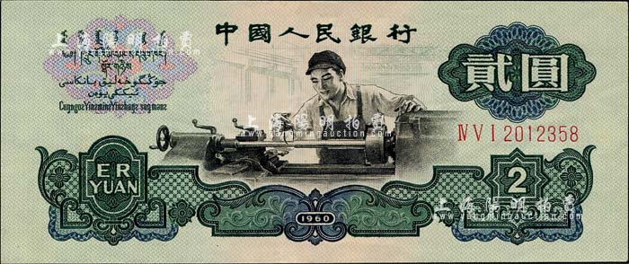 第三版人民币1960年“车工图”贰圆,海外藏家出品,九五成新