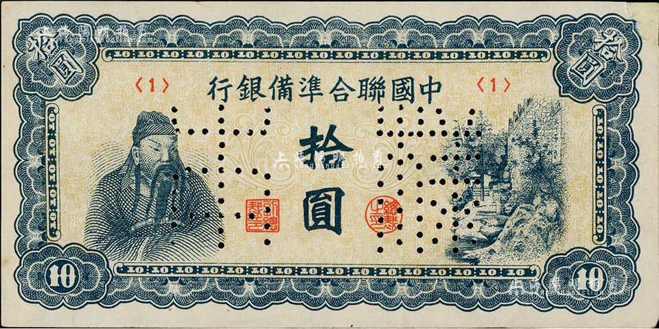 中国联合准备银行(1944年)蓝色左关羽右天下第一泉拾圆样本,正背共2枚;森本勇先生藏品,其中正面券右上角有贴补,八至九成新
