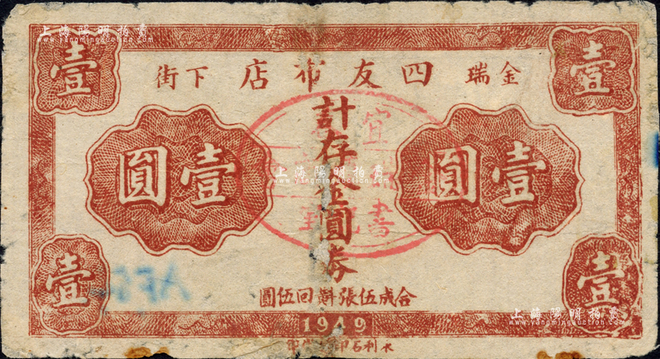1949年四友布店金圆券壹圆,上盖宜春县金瑞镇商会戳记;森本勇先生藏品,有修补,少见,六成新