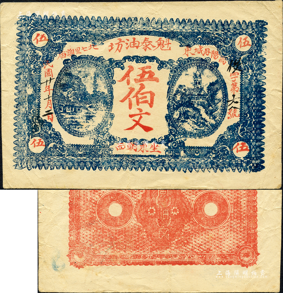民国廿年(1931年)魁泰油坊伍伯文,安徽涡阳县民间钞票;森本勇先生藏品,罕见,八成新
