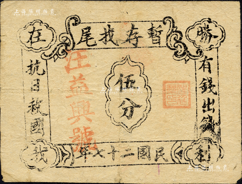 民国二十七年(1938年)汪益兴号·暂存找尾伍分,票上印有“有钱出钱·抗日救国·胜利在我”等字样,极具抗战时代特色;据前辈藏家相告,其实物出自安徽某地;另据区票专家唐德顺先生考证,此券或与新四军相关;森本勇先生藏品,七五成新
