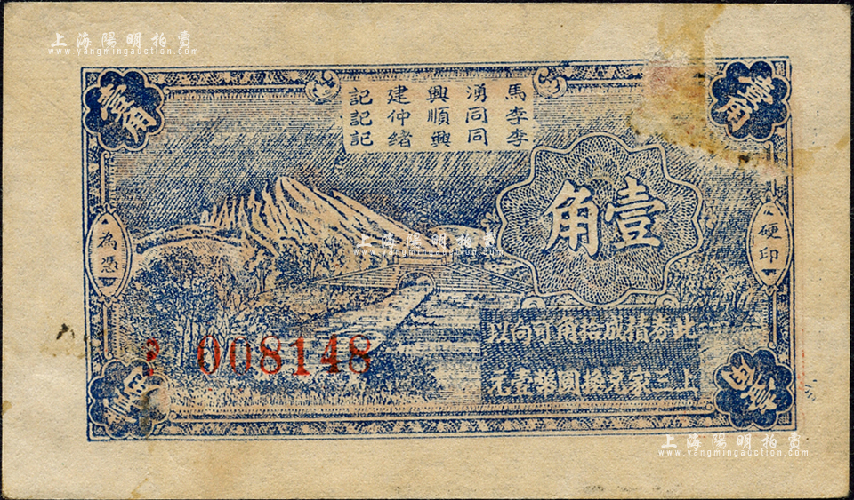 抗战时期(江苏南通)新仁镇临时代价券壹角,其名称印在背面,可向“马湧兴建记、李同顺仲记、李同兴绪记”三家兑换;森本勇先生藏品,票上有揭薄,七五成新