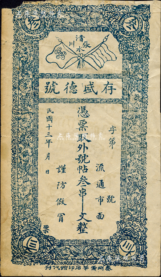 民国十三年(1924年)存盛德号·凭票取外号帖叁串文,甘肃清水县张川镇民间钞票,上印五色旗和铁血十八星旗;森本勇先生藏品,左上角有缺损,七成新