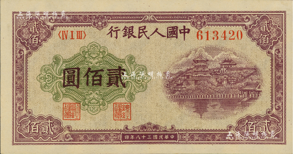 第一版人民币“排云殿”贰佰圆,美国Mr. Kevin藏品,全新