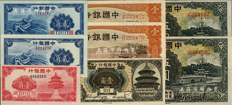 中国银行纸币共8枚,详分:1918年哈尔滨改上海壹角,1935年马耕地天津壹圆2枚连号、黑色伍圆2枚连号,无年份红天坛壹角、长城贰角2枚;江南前辈藏家出品,九五至全新,敬请预览