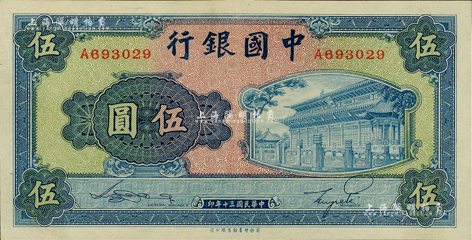 民国三十年(1941年)中国银行商务版岱庙图伍圆,单字轨;海外藏家出品,九八成新