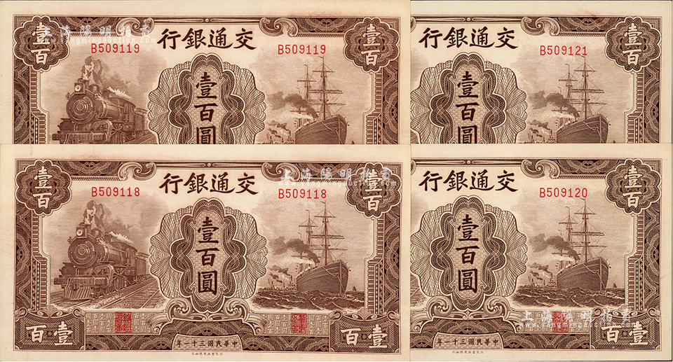 民国三十一年(1942年)交通银行大东版壹百圆共4枚连号,单字轨;江南前辈藏家出品,全新