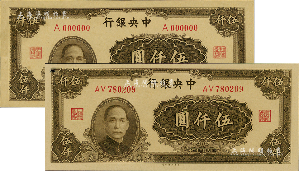 民国三十四年(1945年)中央银行大业版伍仟圆共2枚不同,详分:正票双字轨,梁平·陈延祚签名;样本券单A字轨,仅有正面;其中1枚有一小孔,未折九成至全新