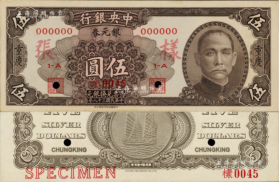 民国三十八年(1949年)中央银行银元券伍圆样本券,正背共2枚,重庆地名,少见,九五成新