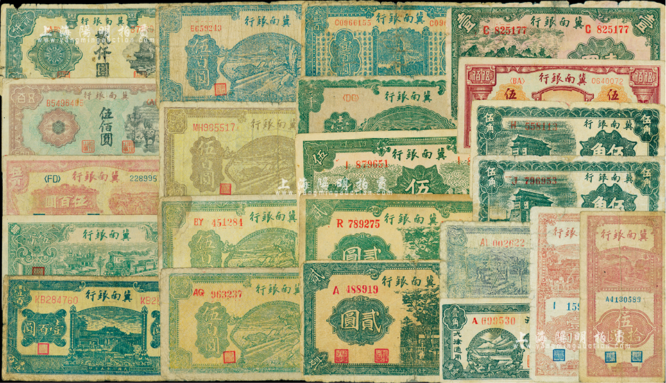 冀南银行纸币22枚,详分:1939年壹角、伍角2枚、壹圆、贰圆2枚、绿色太行伍圆,1942年伍拾圆、壹百圆、贰百圆、壹千圆,1945年平原地名壹百圆、绿色牛耕地伍百圆2枚、棕黄色牛耕地伍百圆、蓝色牛耕地伍百圆,1946年绿牌坊桥壹百圆、绿火车伍百圆,1948年火车伍佰圆、收割图伍百圆、赶骡图伍百圆、贰仟圆;五至八成新,敬请预览