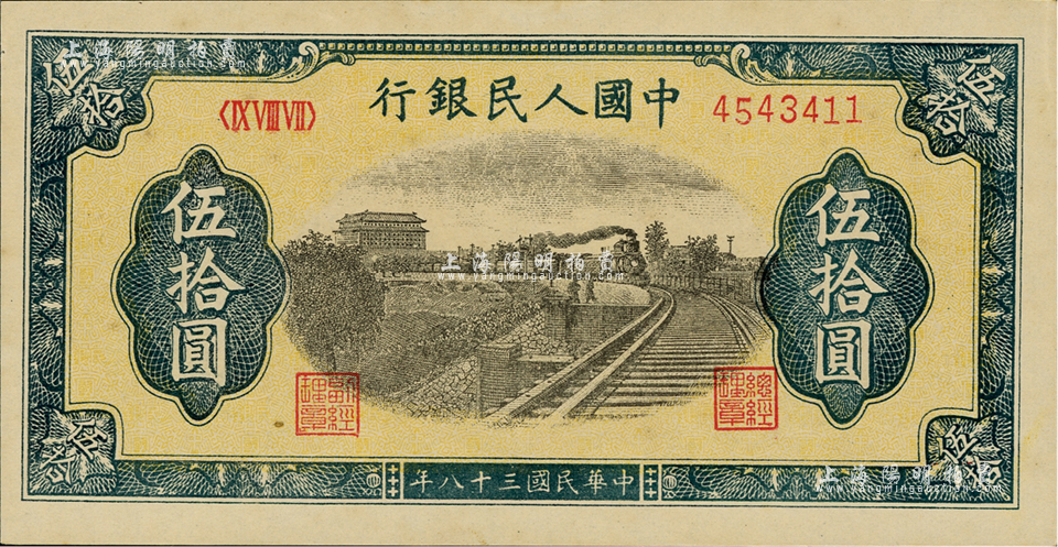 第一版人民币“铁路”伍拾圆,微有黄斑,未折九五成新