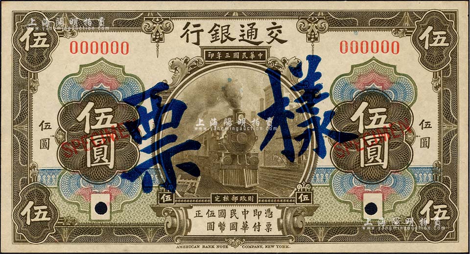 民国三年(1914年)交通银行橄色伍圆样票,正背共2枚,此乃国内银行之存档样本;闻云龙先生藏品,九八成新