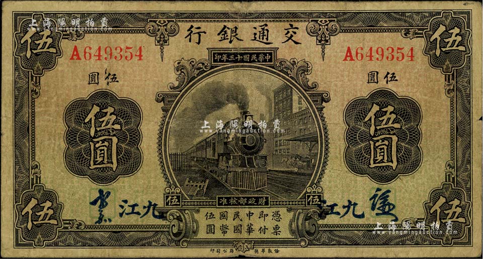 民国十三年(1924年)交通银行伍圆,九江地名,背印梁士诒·胡孟嘉签名;闻云龙先生藏品,背盖收藏章,少见,七成新