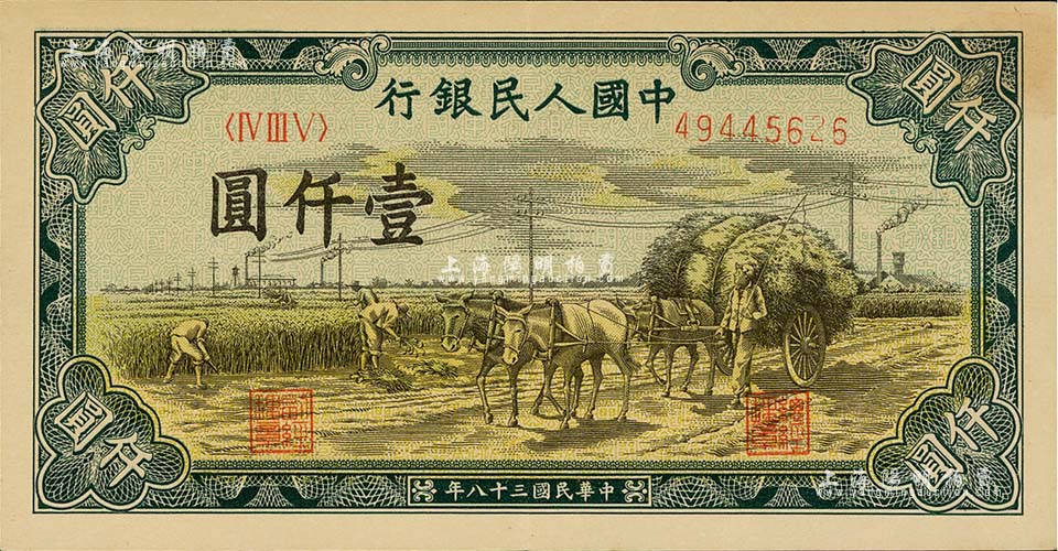 第一版人民币“秋收”壹仟圆,闻云龙先生藏品,背盖收藏章,九成新