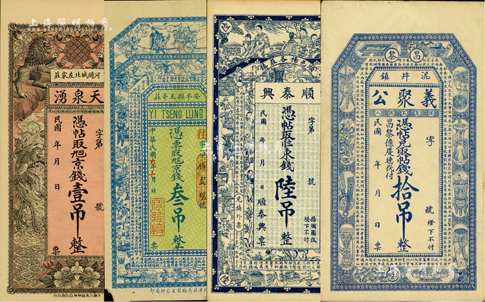 直隶钱庄钞票4种,详分:(顺义)顺泰兴东钱陆吊,上印仕女、博古图和《滕王阁序》古文;(安平)义增隆1917年京钱叁吊,上印三星、博古图及《滕王阁序》古文;(河间)天泉湧京钱壹吊,上印双狮双凤图;(昌黎)义聚公拾吊,上印博古图与韩愈《进学解》古文;美国Mr. Kevin藏品,八至九八成新