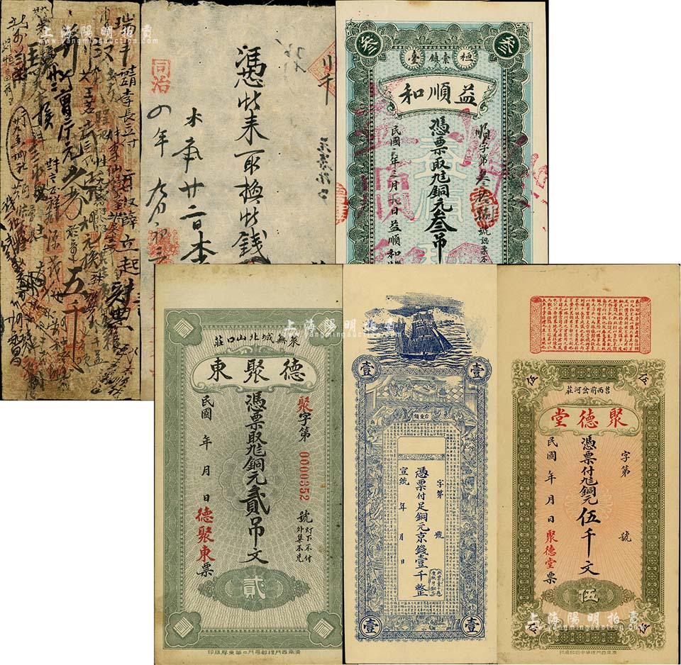 钱庄钞票6种,详分:同治四年(1865年)元泰德具贰千文,发行于山西代县;光绪廿七年(1901年)玉堂五千文,发行于山东济宁;宣统年(台东镇)铜元京钱壹千文;(莒县)聚德堂铜元伍千文;(桓台)益顺和铜元叁吊;(莱芜)德聚东铜元贰吊文;美国藏家出品,六至九五成新,敬请预览
