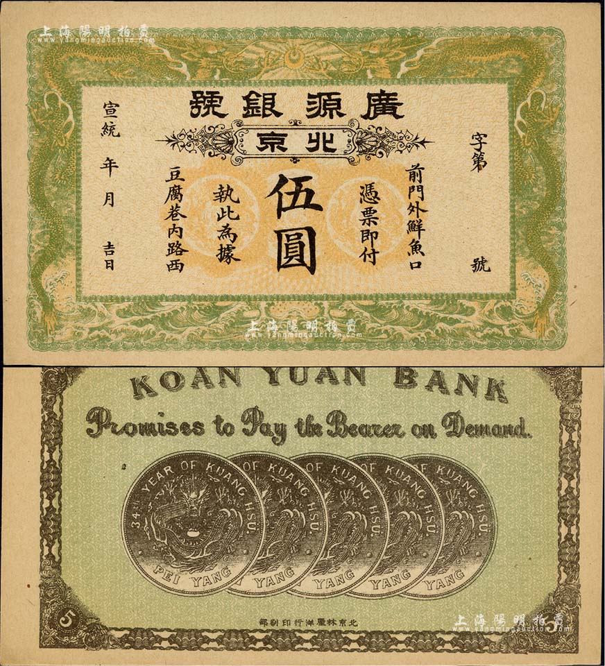 宣统年(1909-11年)广源银号伍圆,北京地名,背印五枚北洋银币图;源于四十年代京城前辈名家骆泽民先生之旧藏,九五成新