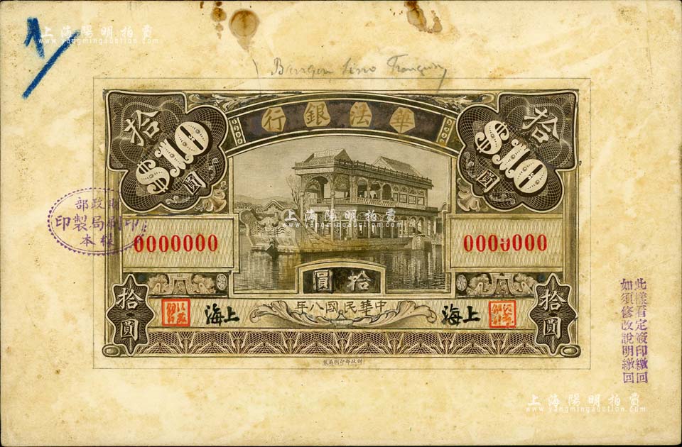 民国八年(1919年)华法银行财政部版拾圆之单面手绘设计稿,上海地名,上为颐和园石舫图,且票上盖有“财政部印刷局制印样本”戳记,乃属洋商客钞未正式发行之一大珍品;该行约成立于1919年,属中法合资性质,中方总裁王鸿逵(曾任山东、长芦盐运使)、董事会长张弧(曾任北洋政府币制局总裁、财政总长),亦发行有老股票存世;美国藏家出品,目前为之仅见,九成新