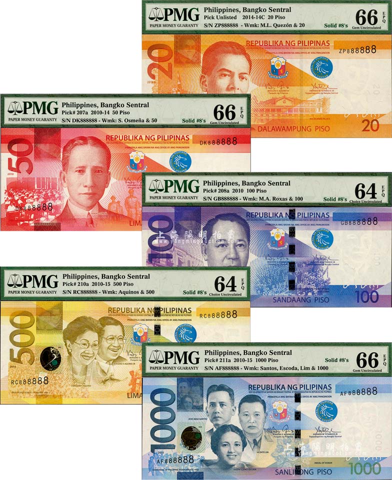 菲律宾趣味号码券共5枚全套,详分:2014年20比索,趣味号码ZP888888;2010年50比索,趣味号码DK888888;2010年100比索,趣味号码GB888888;2015年500比索,趣味号码RC888888;2015年1000比索,趣味号码AF888888;海外藏家出品,颇为难得,全新