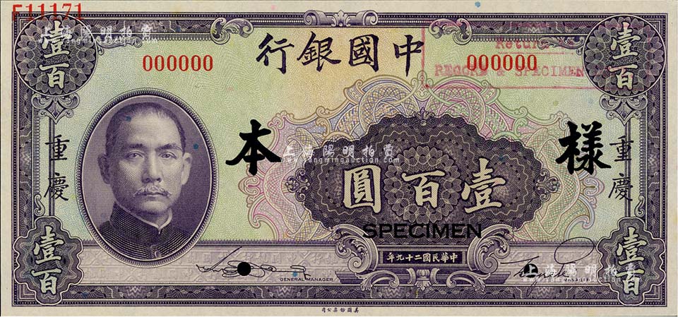 民国二十九年(1940年)中国银行美钞版壹百圆样本券,重庆地名,正背共2枚,江南藏家出品,全新