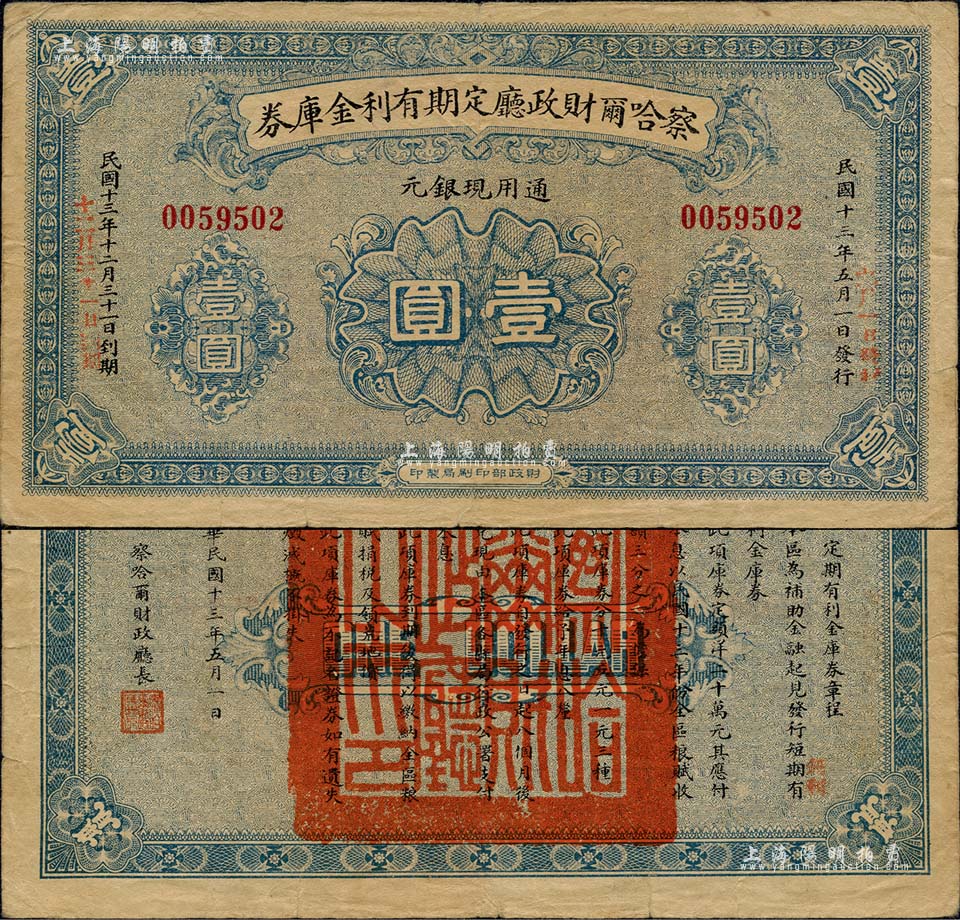 民国十三年(1924年)察哈尔财政厅定期有利金库券通用现银元壹圆,由财政部印刷局印制,背印库券章程;省钞之珍罕品,目前存世仅见数枚,原票七五成新