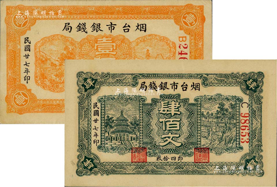 民国廿七年(1938年)烟台市银钱局壹佰文、肆佰文共2种不同,九六成新
