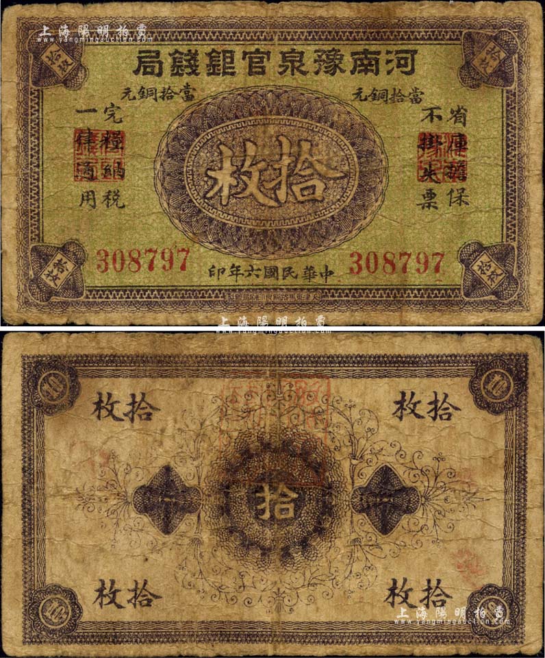 民国六年(1917年)河南豫泉官银钱局当拾铜元拾枚,省钞之珍罕品种,且其版式与先前所见者略有不同(先前所见者,其银行名称左右均印有红色带方框“乙”字),自然七成新