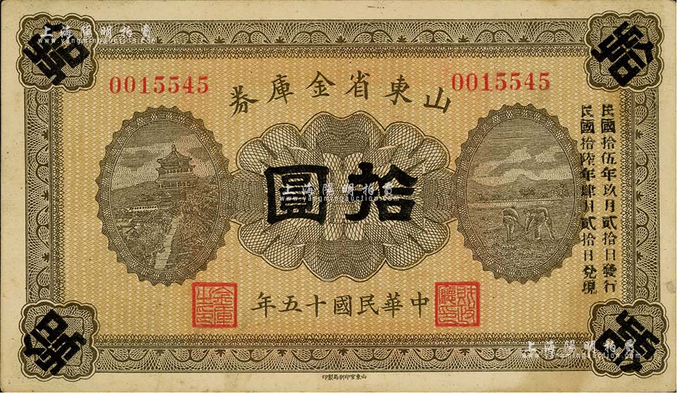 民国十五年(1926年)山东省金库券拾圆,加印“民国拾伍年玖月贰拾日发行,民国拾陆年肆月贰拾日兑现”,军阀张宗昌氏发行,此种发行日期较为少见;资深藏家出品,八五成新