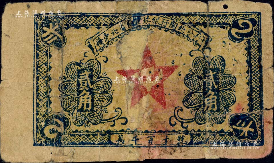 1932年赣东北省苏维埃银行闽北分行贰角,属方志敏领导的赣东北省苏维埃政府所发行,其中由闽北分行发行的存世极为珍罕;江南前辈藏家出品,有修补,六成新