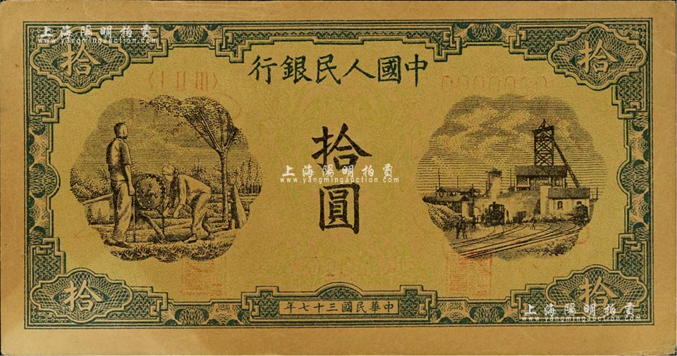 第一版人民币“灌溉与矿井图”拾圆票样,正背共2枚,其中正面有黄斑,未折八至九成新