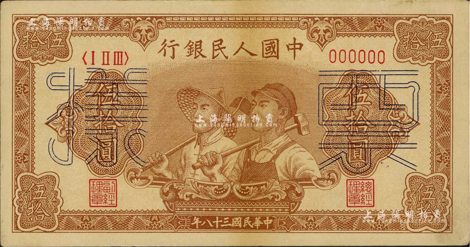 第一版人民币“工农图”伍拾圆票样,6位数号码券,正背面合印,未折九成新