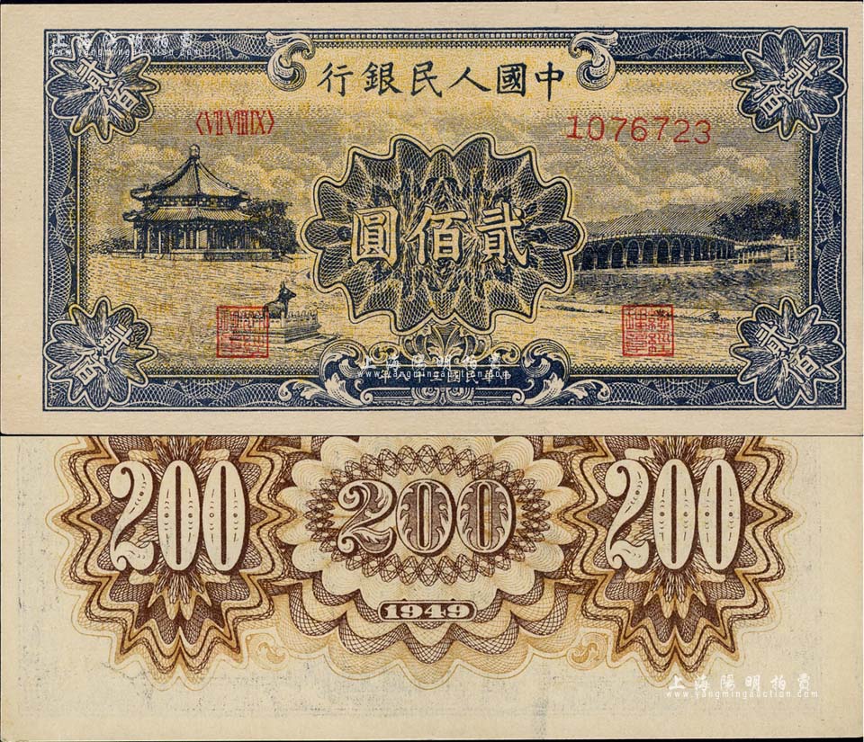 第一版人民币“颐和园”贰佰圆,薄纸版,背面色泽极深,与一般所见者不同,九八成新