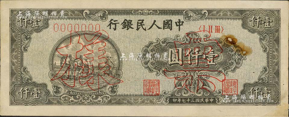第一版人民币“狭长版双马耕地”壹仟圆票样,7位数号码券,正背面合印,背有贴补及小揭薄,八成新