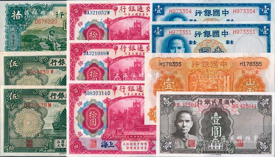 国钞10枚,详分:中国银行1934年山东壹圆、天津拾圆,1937年德纳罗版壹圆2枚;交通银行1914年上海拾圆3枚,1935年帆船图伍圆2枚;中国农民银行1941年德纳罗版壹圆;九八成新
