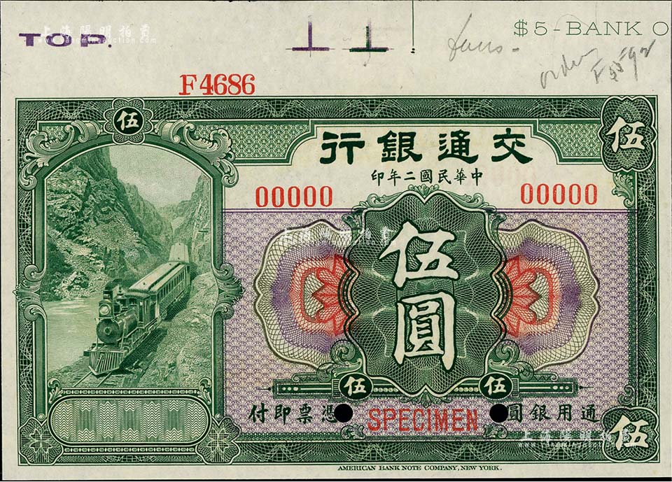 民国二年(1913年)交通银行伍圆样本券,上端带有版铭,九八成新